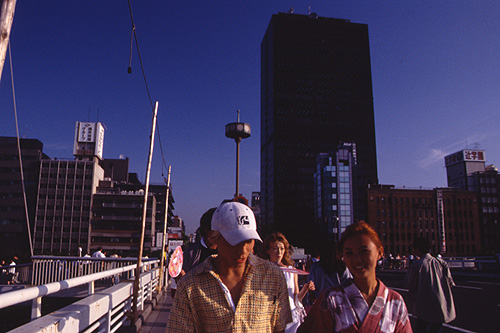 | 2001.7.25 天神祭 大阪の夏といえば天神祭。学生時代に花火を見に行って以来ごぶさただったので、会社をフレックスで早く出て天満橋へ。この日のフィルムはまずダイナハイカラーで撮り、その次は初使用のE200。しかし手持ちがこれで終わってしまったのだが、まだ日は明るい。急遽天満橋駅にあるカメラ屋でEB2を買って撮影続行。祭は久しぶりなので、いかんせん撮らされたきらいはあるが、最後は駅の出口でじっくり狙う。 Canon EOS7 EF28〜135mmF3.5-5.6IS ダイナハイカラー100、E200 |
