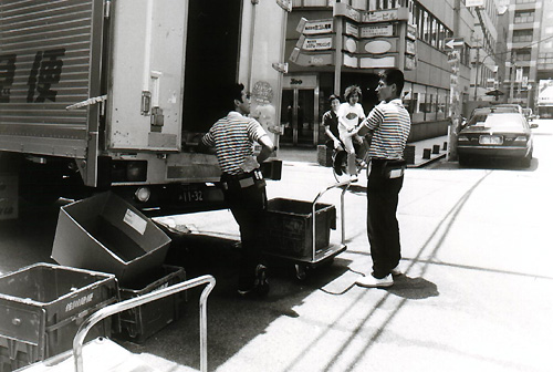 | 2001.7.19 本町、千林 Canon NewF-1 FD28mm F2 ネオパン 400 PRESTO 昼休みに床ちゃんと会社周辺を撮影する。時間が限られて苦しいが、つかの間の撮影タイムを楽しむ。日が長いので、会社が終わってから千林の商店街へ。こちらは単独で撮影。F-1はアイレベルファインダーなのでマニュアル専用だがモノクロなので、露出はだいたいでフレーミングに集中する。 |