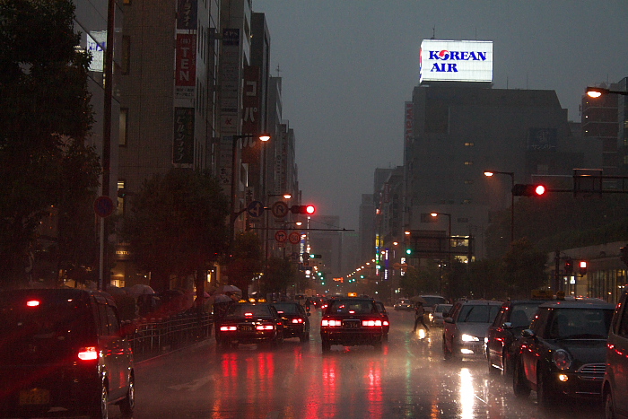 | 2007.6.29 雨の堺筋本町、野江 雨の天気予報を聞いてキスデジを持ってきた。18時半に会社を出る。傘が要るか要らないか程度の雨だが、少し前にまとまって降ったので路面は濡れている。本町通りを堺筋本町まで歩いてきたところで雷が鳴り、激しい夕立になった。雨に濡れることも忘れ、交差点で必死に撮影する。ふと我に返るとスラックスがずぶ濡れ。靴も水の中を歩いてきたように濡れている。ひとまず地下に逃げたが、風も出てきてこの格好で撮影は不可能と判断。堺筋線で北浜へ出る。京阪に乗り、京橋でミックスジュースを流し込む。普通に乗ってどこかで撮影と思っていたが隣の野江で下車。雨は上がり、空はまだ明るい。京橋の高層ビルが見えるホーム西側はいい感じ。手ブレ補正を持ってくるべきだったと後悔。線路沿いの道と電車の組み合わせを狙ってしばらく粘る。電車は頻繁にやってくるが、なかなか歩いている人とうまく組み合わせられない。やっとというときにメモリ満タン。仕方なく帰る。 Canon EOS Kiss Digital N EF-S18-55mm F3.5-5.6II USM (35mm換算:29〜88mm) |