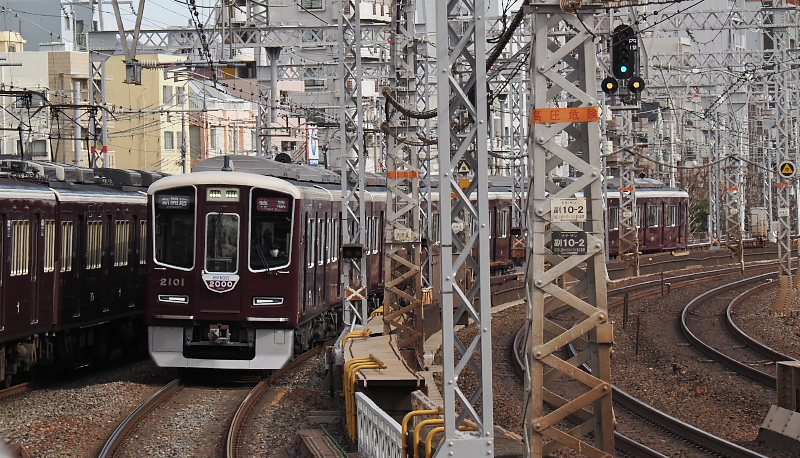 ![]() 左側は嵐山から今津線経由の宝塚行き直通特急「とげつ」 十三 2012.4.7 |