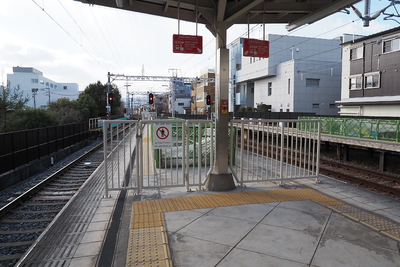 駅の梅田側にある踏切から駅を見る