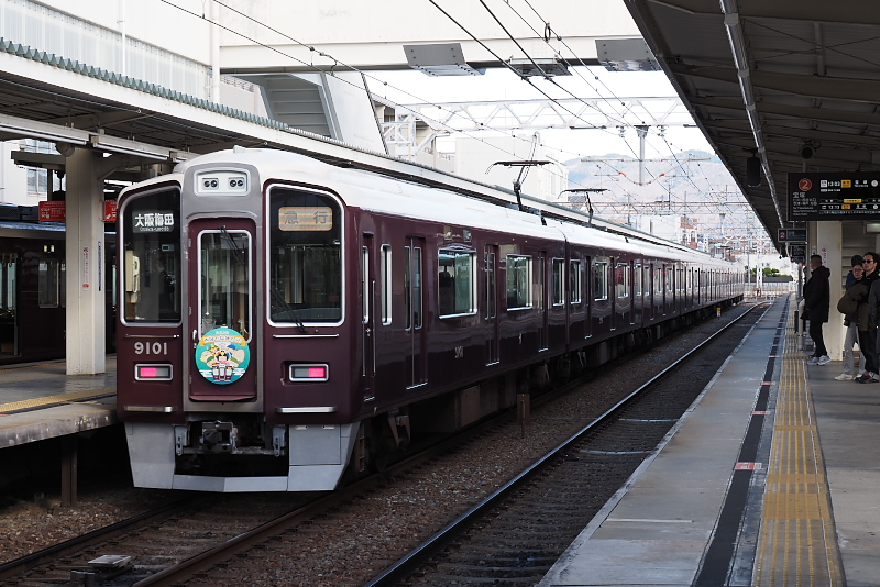 車庫から出庫してきた9000系。雲雀丘花屋敷ゆきの普通列車はいったん平井車庫まで引き上げる。